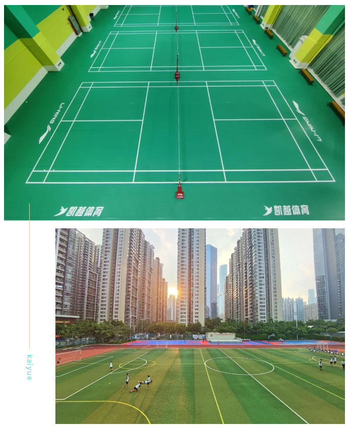 凯越体育猎德实验学校运动中心拥有标准七人制足球场,两个室外篮球场,四片标准室内羽毛球场。公司教育理念:“始终把孩子体育教育放在第一位”,我单位将严格按照学校要求,助力学校开展体育特色课程,培养学生体育运动兴趣,提高体育特色项目的运动水平,将学校特色项目继续发展壮大。